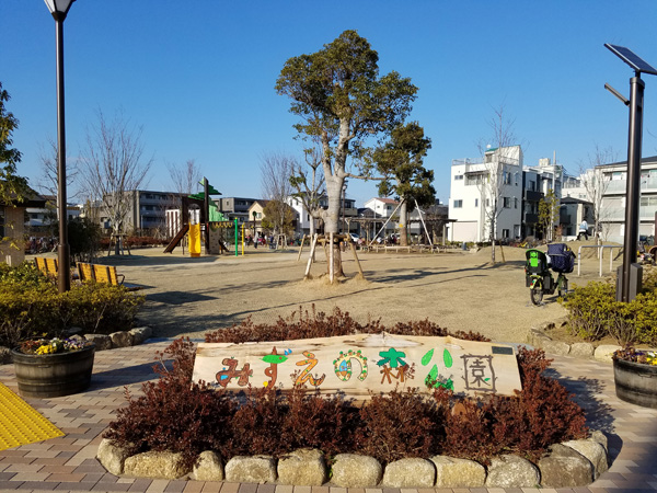 みずえのもりこうえんは、 へいせい28ねん2がつ28にちに できたばかりの あたらしい こうえんです。 えんめいばんは がっこうの みんなで アイディアをだし、 そのなかから えらばれた デザインで つくられました。 がっこうが おわったあと、 ともだち みんなで げんきに あそんでいます。