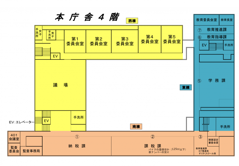 トップページ > シティインフォメーション > 江戸川区の概要 > 施設案内 > 分野で探す > 区役所・事務所・区民館 > 江戸川区役所 > 庁舎内配置図 > 本庁舎 > 4階