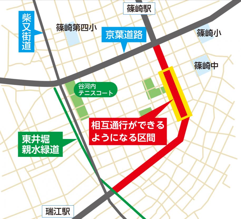 京葉道路から東井堀親水緑道までの区間の都市計画道路で相互通行ができるようになります