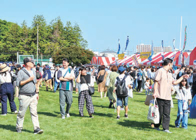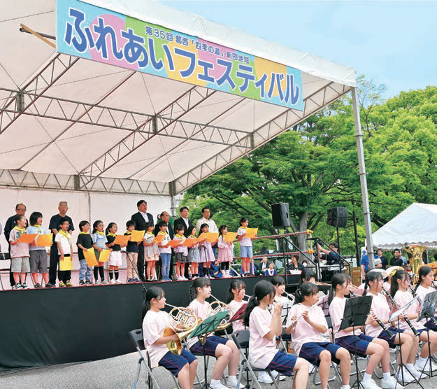 地域まつりの式典では、合唱や吹奏楽とともににぎやかに区歌を歌います
