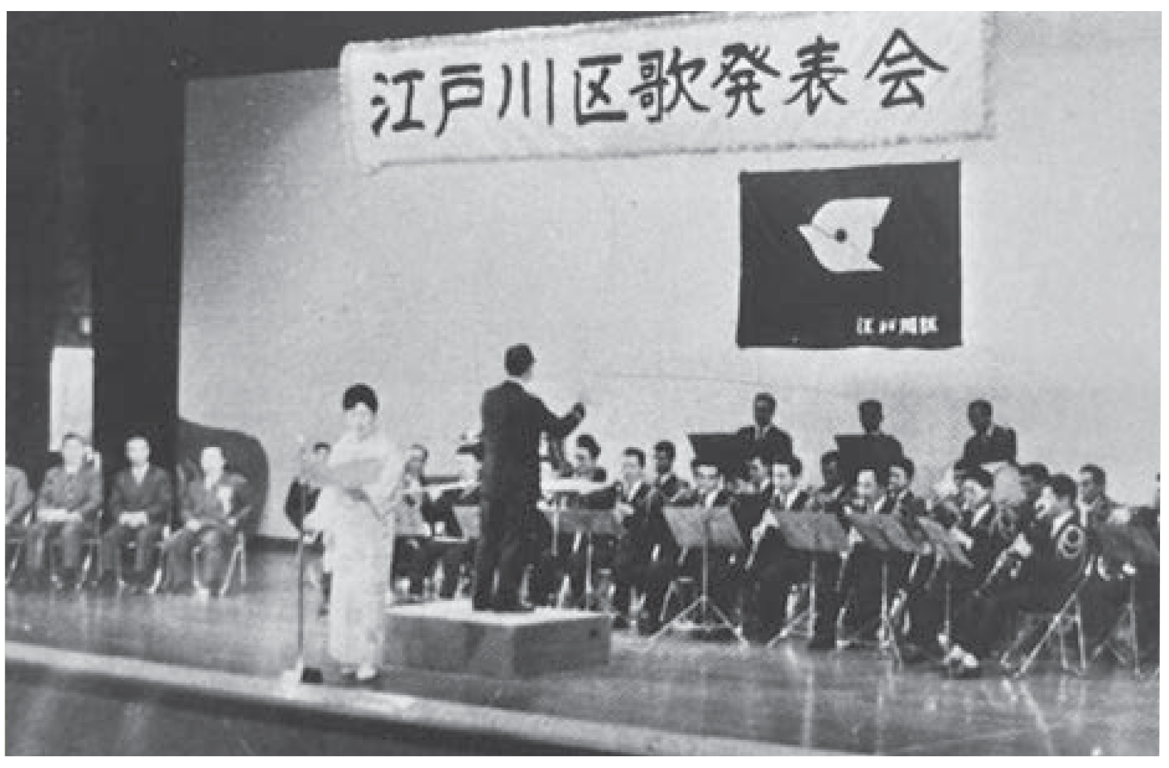 「江戸川区歌」が誕生したのは昭和40年。戦後の復興を経て、高度経済成長真っただ中にあった時代です。当時、全国の自治体では、地域の一体感や郷土愛、まちの躍進を表すシンボルとして区市町村歌の制定が相次いでいました。本区でも区歌を制定するに当たり、広報誌や新聞などで歌詞を募集。全国から300件以上あった応募作品の中から、岡久美子さんが作詞した歌詞が選ばれました。そして、作曲家の清水保雄さんによりメロディーが付けられ、同年9月に区歌として制定されたのです。