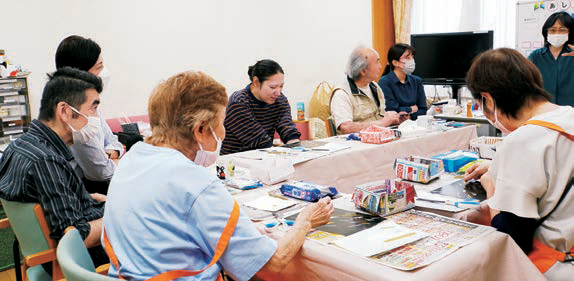 西葛西熟年相談室が設置されているなぎさ和楽苑の若年性認知症専門デイサービス「フリーサロンあしたば」では、1カ月に一度、“誰でも楽しめるアート”をコンセプトにした「あしたばアート」が開催されています。創作活動を通して認知症の予防や改善、心の開放や意欲向上を促すことを目的とする臨床美術を用いた活動です。ある日の活動では、「宇宙」をテーマに黒い紙にキラキラのペンや絵の具を用いて、利用者の方やスタッフ、ボランティアの方など、みんなで和気あいあいとした雰囲気の中、それぞれの作品を作り上げていました。参加された皆さんは、「楽しかった」「満足いく作品ができた」と感想を話してくれました。