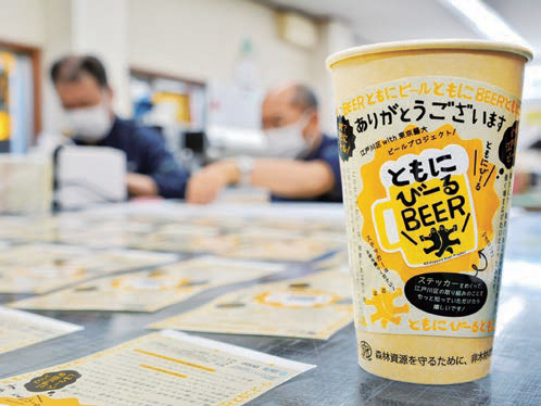 障害のある方々が働く事業所で製作された「ともにビール」オリジナルカップ