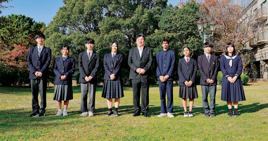 (左から)藺草青衣(いぐさあおい)さん、谷陽菜子(たにひなこ)さん、園田雄大(そのだゆうだい)さん、鈴木智咲子(すずきちさこ)さん、斉藤区長、ジャ・アプールバさん、カール・ラハットビールさん、石塚優海(いしづかゆう)さん、原田理子(はらだりこ)さん
