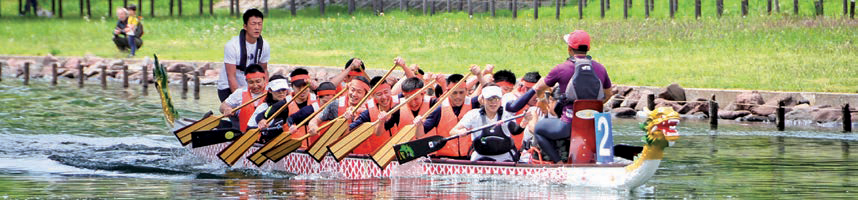 旧中川の春の風物詩「ドラゴンボートレース」(200メートル)に参加しませんか。20人乗りのボートにドラゴンの頭と尾が装飾された「ドラゴンボート」をチームで協力してこぎ、タイムを競います。