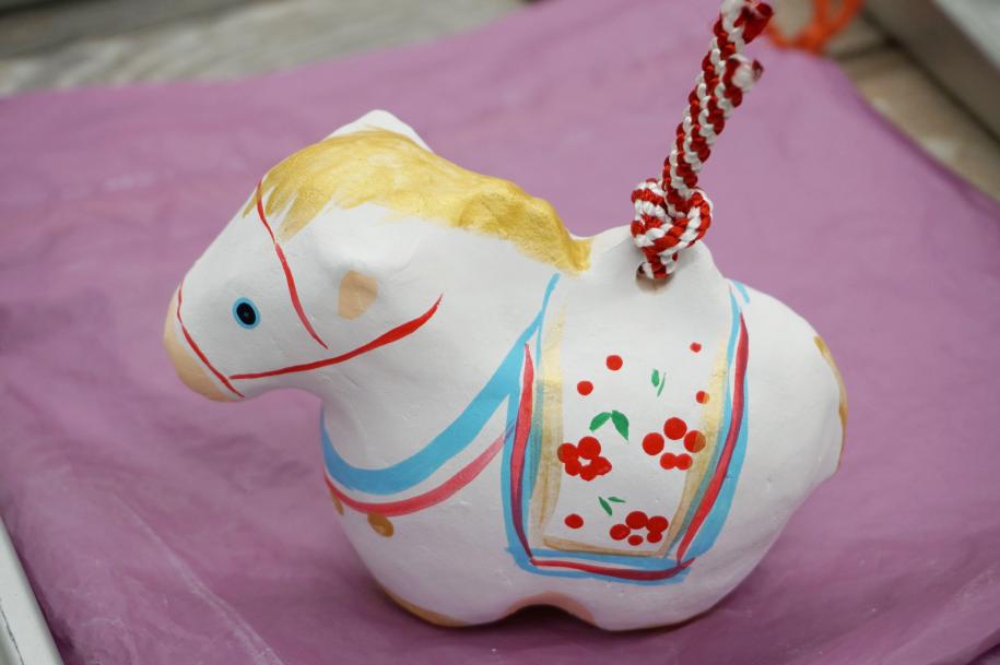今年作られた「午」の干支鈴は、高さ約9cm、幅約12cm、奥行約6cmの手のひらサイズ。デザインは職員のオリジナルで、丸みを帯びたフォルムに、色とりどりの細い線を塗って鮮やかに仕上げており、1年間かわいがって飾ってほしいという願いが込められています。全て手作りのため、一つ一つに個性があり、愛らしい表情の干支鈴に仕上がっています。