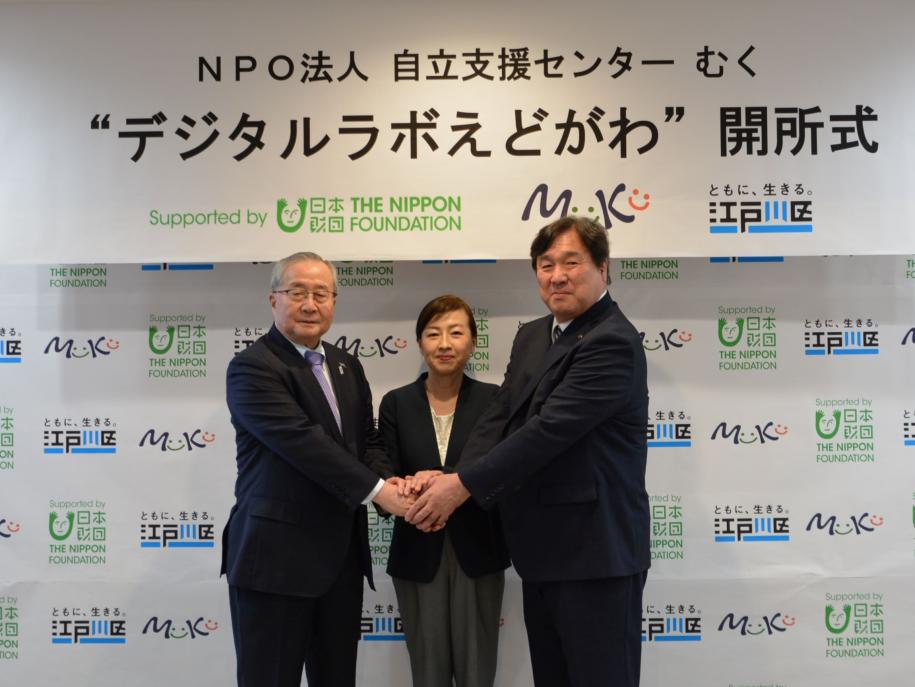 様々な事情により働きづらさを抱える方の新たな就労先「デジタルラボえどがわ(新堀2丁目)」の開所式が本日(20日)午後1時30分より開催され、江戸川区斉藤猛区長、公益財団法人日本財団(港区赤坂1丁目)尾形武寿会長らが出席しました。同施設は特定非営利活動法人自立支援センターむく(理事長:伊東美奈子/鹿骨5丁目)が整備・運営しています。