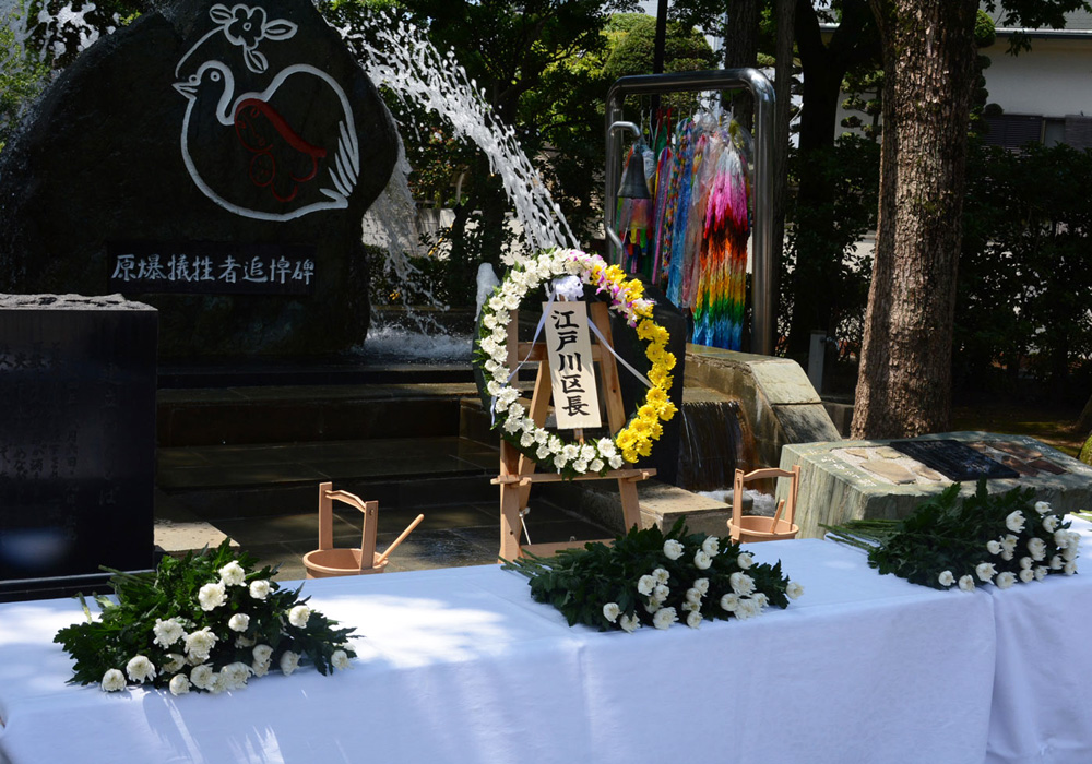 被爆地から遠く東にある江戸川区中葛西の区立滝野公園には、原爆による犠牲者を悼む「原爆犠牲者追悼碑」が立てられています。区内の被爆者団体「親江会」の皆さんが中心となって昭和56年に作った石碑を、区が公園内に建立したものです。画家の故丸木位里・俊夫妻の筆による、原爆の犠牲になった母子がハトになり空を舞うという「平和の図」が刻まれた石碑に、区幹部職員とともに毎年この時期に参拝しています。