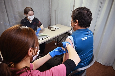 現在、本区では、オミクロン株対応ワクチンを区内の指定医療機関と14カ所の集団接種会場、合わせて一日5000回の接種ができる体制を整えています。「旧くつろぎの家」「総合文化センター」では予約なしでも接種いただけます。