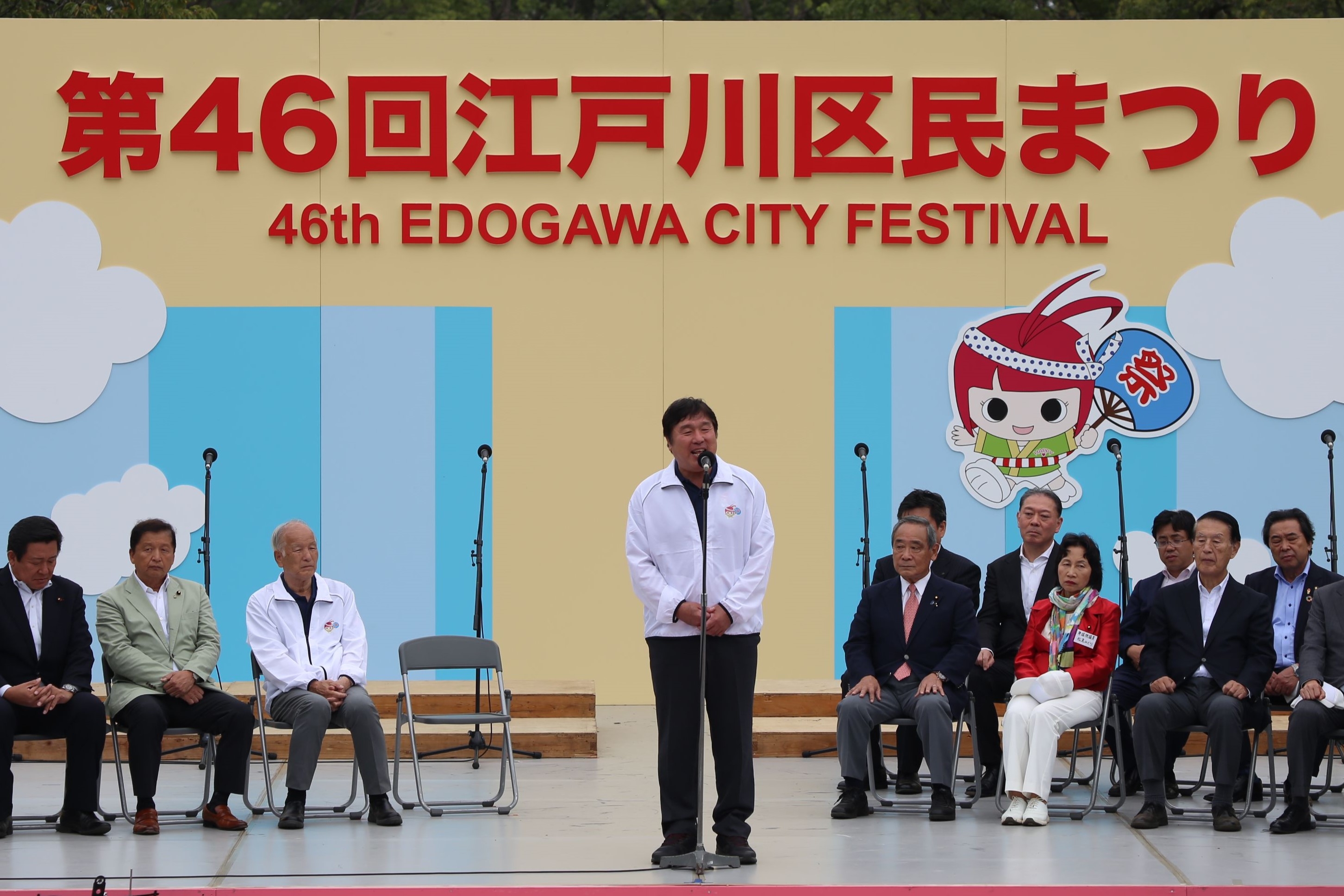 過ごしやすい天気に恵まれたこの日、5年ぶりに「江戸川区民まつり」が開催されました。「ひろがる つながる 笑顔の輪」を合言葉に、1978年から始まった区民の皆さまによる手作りのまつり。区内最大のこのまつりも、46回目の開催となりました。この日開催にあたって中心となったのは、400団体15,000人もの住民ボランティアの皆さまです。何日も前から準備を重ね、地域コミュニティの発展にご尽力いただいた皆さまに心より感謝申し上げます。