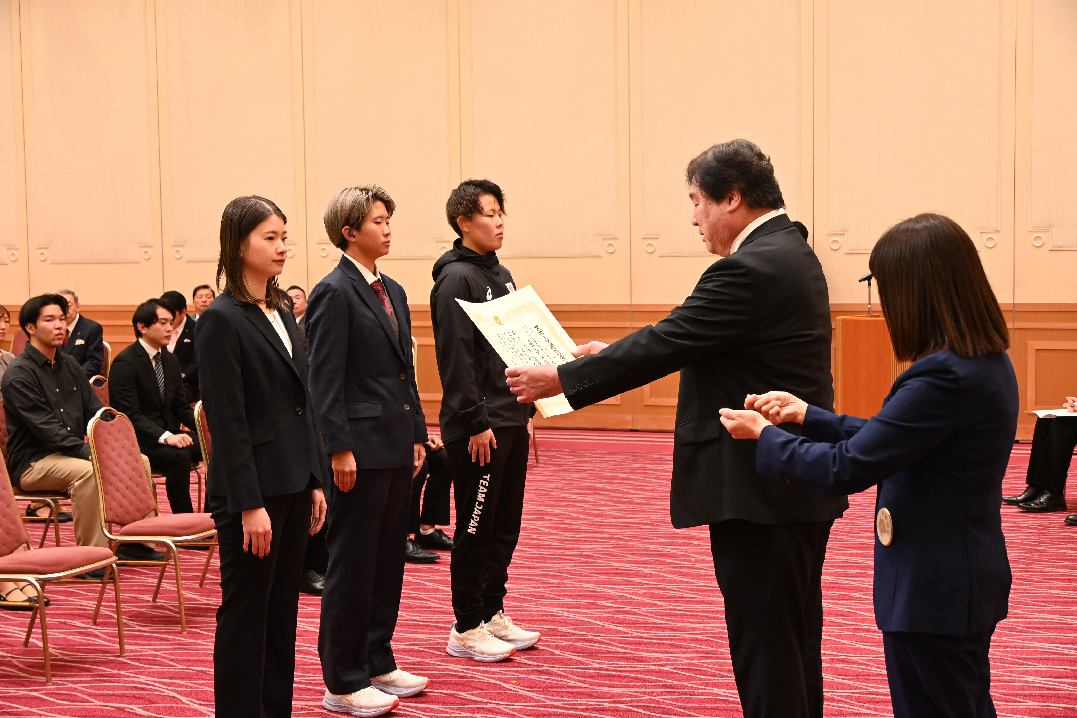 今回特別栄誉賞を受賞されたお三方は、先月の26日まで開催された耳がきこえない・きこえにくいアスリートのための国際スポーツ大会「東京2025デフリンピック」で金メダルを獲得された長谷山(はせやま)選手(バレーボール)と、銀メダルを獲得された久住呂(くじゅうろ)選手、國島(くにしま)選手(ともにサッカー)です。