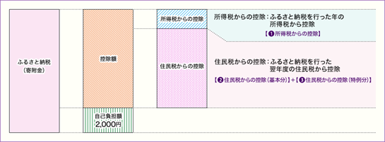 - 原則、ふるさと納税(寄附)をした金額のうち2,000円を除いた全額が控除されます。