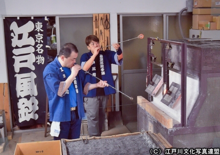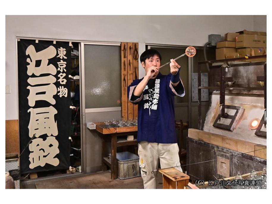 江戸時代から伝えられるガラス風鈴。現在も作り続けている都内ただ1軒の工房です。篠原儀治氏は、風鈴の区登録無形文化財保持者であり、平成16年に名誉都民の称号を贈られました。細いガラス管の先に溶かしたガラスを付けて、息を吹き込んでふくらませる名人技を息子・孫と一家で守っています。