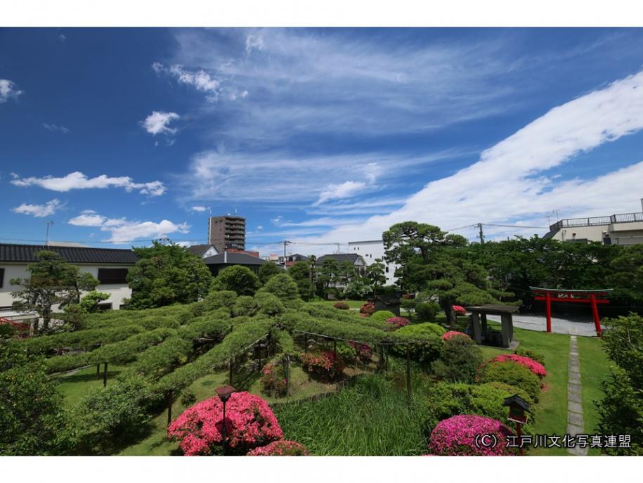 枝張りが大きい松で、区登録天然記念物です。樹齢は推定500年、高さ5メートル、東西16.5メートル、南北18.4メートルです。「新編武蔵風土記稿」にも高い老松に関する記述があり、この松と考えられています。境内の弁天堂は貞享元年(1684)に禅尼が創建したもので、弘法大師作と伝わる弁財天女像が祀られています。松は、区の景観重要樹木に指定されています。