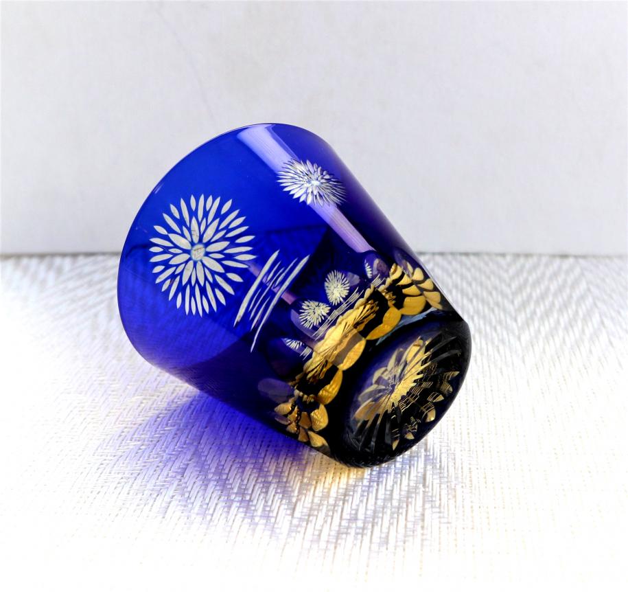 夏の夜空と川面の深い青に浮かび上がる大輪の花火と、川面に映る金色の花火の光を切子で表現した、涼やかで風流なグラスです。