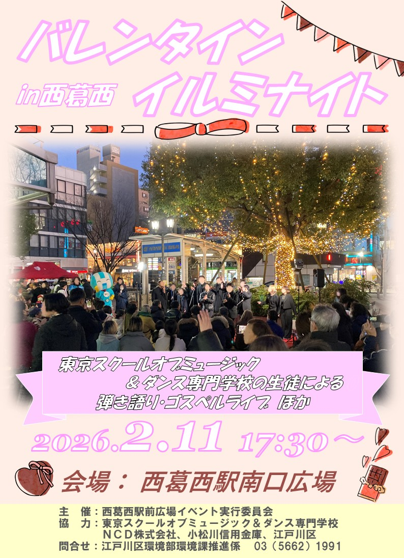 西葛西駅南口に設置したステージにて、イルミネーションの点灯式及び東京スクールオブミュージック&ダンス専門学校(TSM)の学生と今注目のアーティストによる演奏を行います。