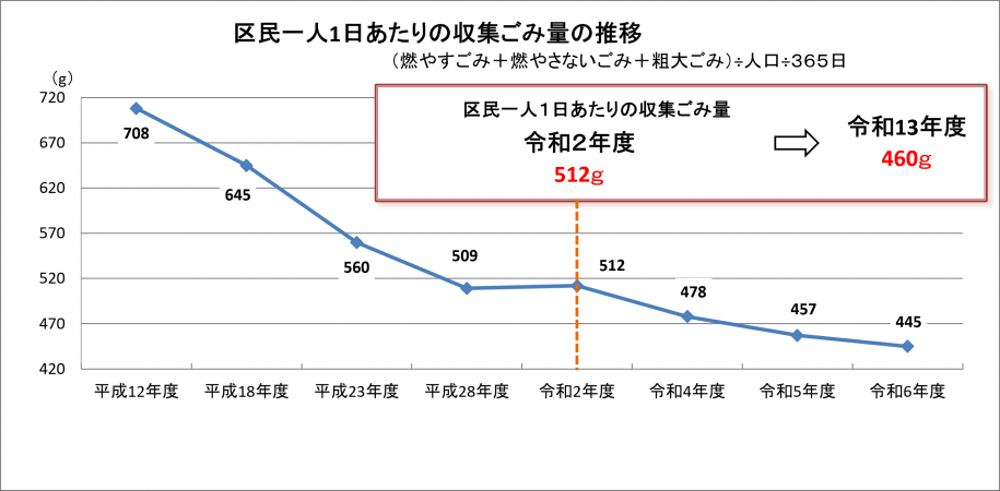 第2次Edogawaごみダイエットプランでは、区民一人1日あたりの収集ごみ量を令和13年度までに令和2年度比(512グラム)で10パーセント(52グラム)削減することを目標としています。なお、令和5年度時点で区民一人1日あたりの収集ごみ量は10.7パーセント(55グラム)の削減ができ、目標を達成することができました!