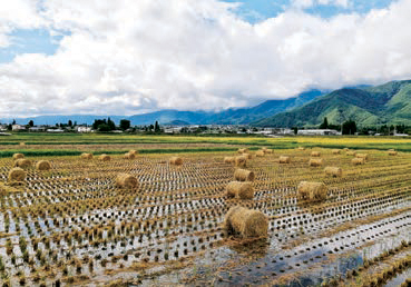 安曇野の秋の田園風景では、刈り取りを終えた田んぼにくるりと丸まった稲わらロールが点在しています。収穫の喜びと秋の深まりを感じさせてくれる、かわいらしいアートです。