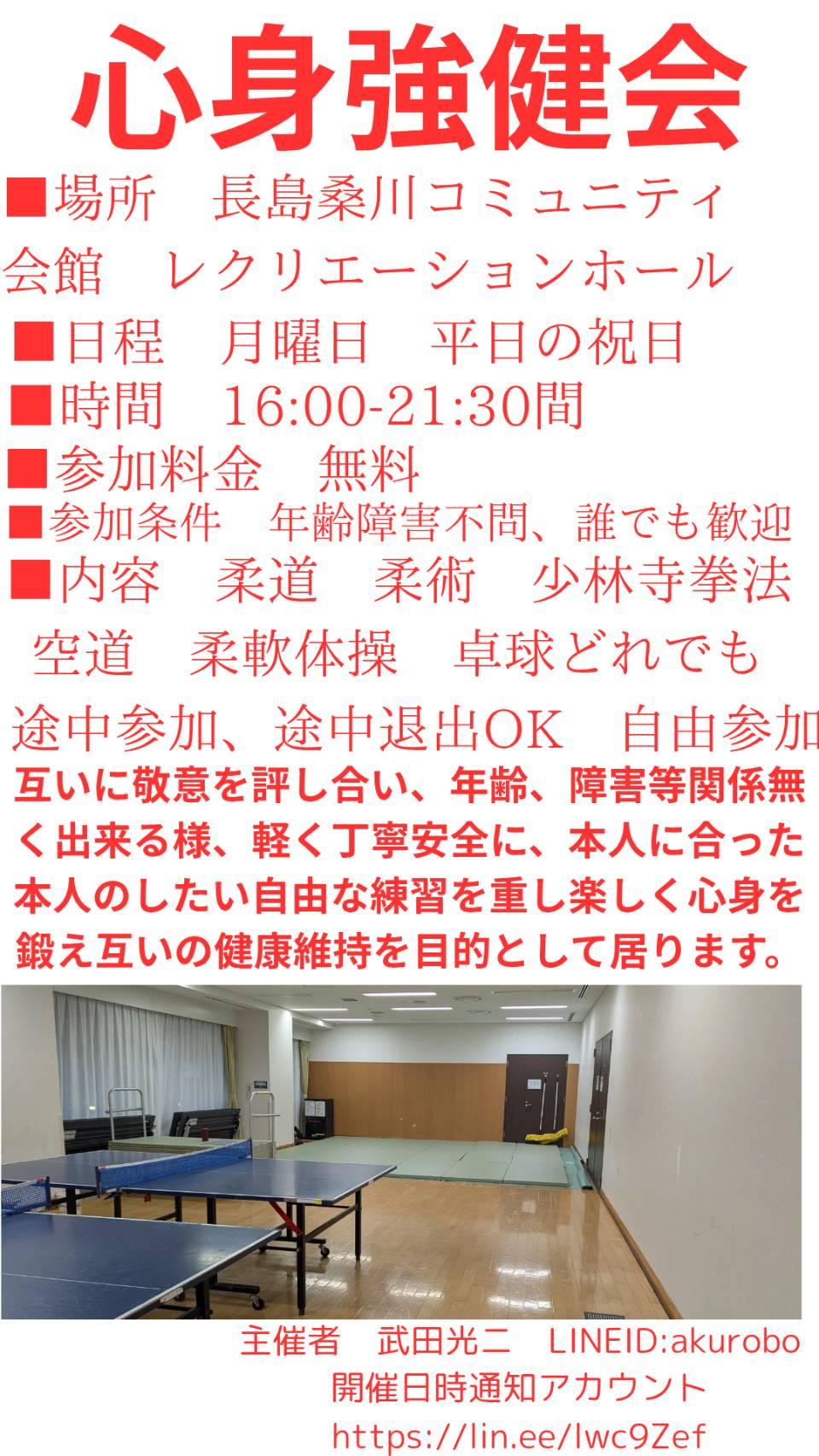 互いに敬意を表し合い、年齢・障害等関係なく楽しめる様、緩く、丁寧、安全に、本人に合った本人のやりたい練習を重視して楽しく安全に身心を鍛え、健康維持を目的としております。