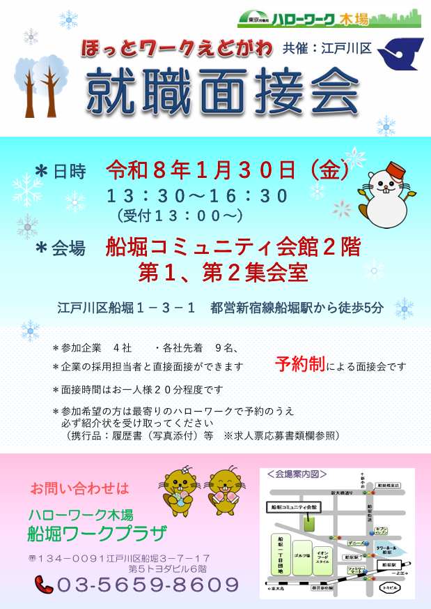 面接会は予約制となります。面接会への参加申し込みは、各ハローワークの職業相談窓口経由で船堀ワークプラザへお申し込みください。