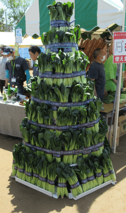 江戸川区特産の小松菜を積み上げ、2mもの高さのタワーとして展示します。