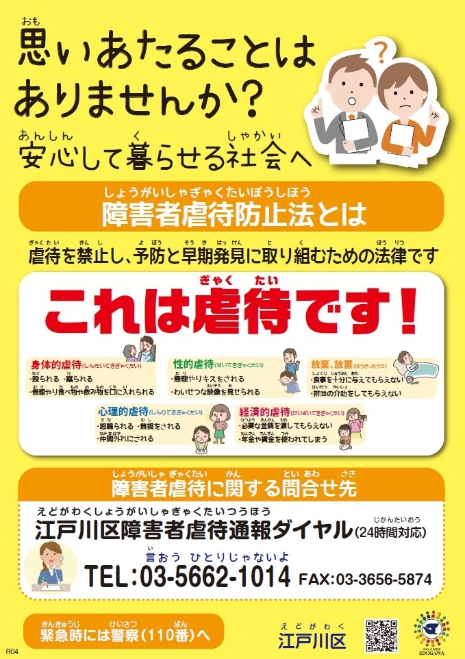 平成24年10月1日に「障害者虐待の防止、障害者の養護者に対する支援等に関する法律」(障害者虐待防止法)が施行されました。