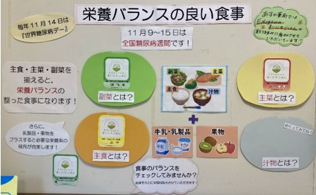 11月は、14日のワールドダイアベティスデイ・12日~18日の全国糖尿病週間にちなみ、「主食・主菜・副菜を知る」をテーマにした活動を展開をしています。