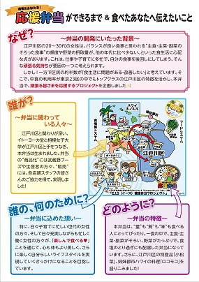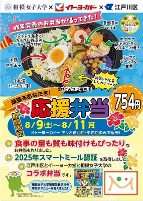 「EdogawaまいにちごはんE.I.S(イース)健康弁当プロジェクト」は、江戸川区とイトーヨーカ堂、相模女子大学が連携しています。