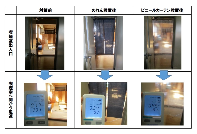 対策前は気流が毎秒0.17メートルであったが、のれん設置による対策後は毎秒0.24メートルに改善し、技術的基準を満たした。さらに、ビニールカーテン設置による対策ではのれんよりも効果的で、気流が毎秒0.45秒メートルに改善した。