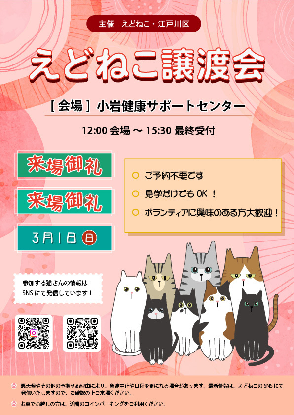 会場受付は12時00分から開始します。会場受付は譲渡会が混雑した場合、入場までお待たせすることがあります。ご注意ください - 猫を迎えるか検討中の方、譲渡会を見学したい方、ボランティア活動に興味がある方は混雑緩和のため、13時以降のご来場をおすすめします。