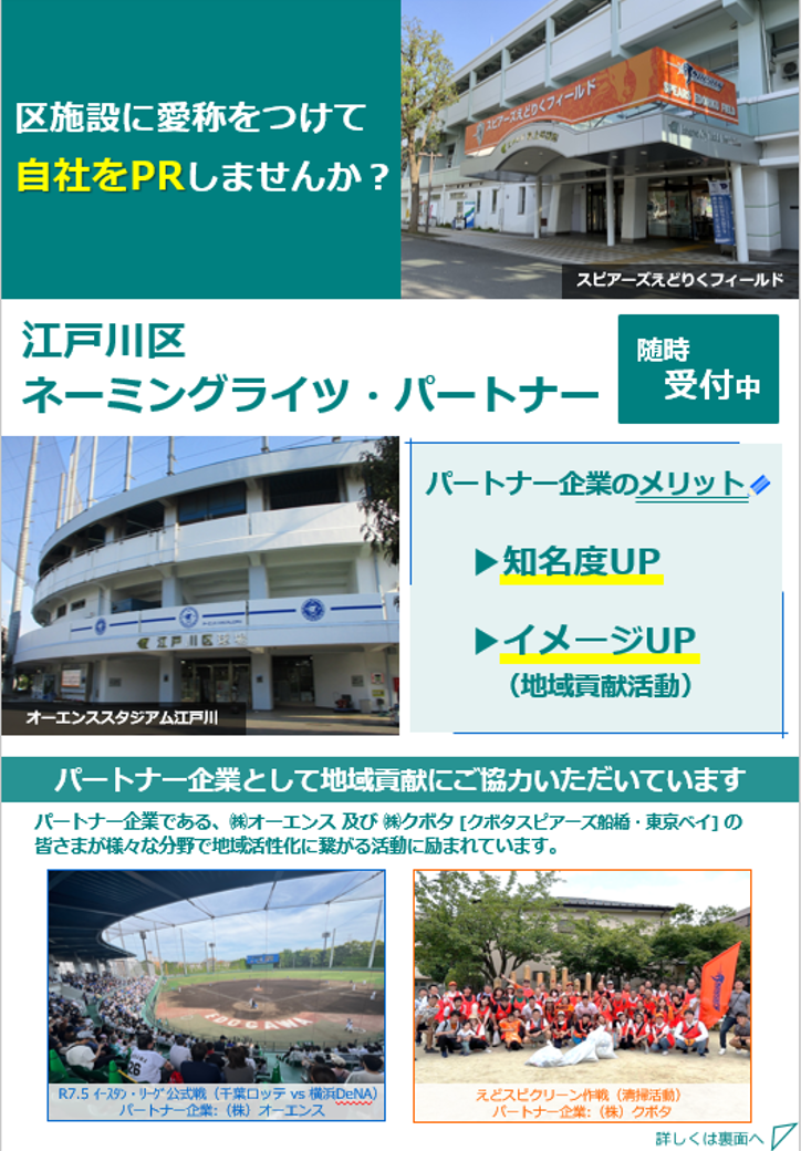 公募を希望される方は、ネーミングライツ導入に関するガイドラインを確認の上、江戸川区ネーミングライツ提案申込書を提出してください。
