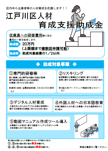 区内産業の人材採用後の定着、競争力の強化による地域経済の活性化を図るため、区内中小企業者等が従業員の人材の育成に資する取り組みを行うに当たって、その経費の一部を助成します。