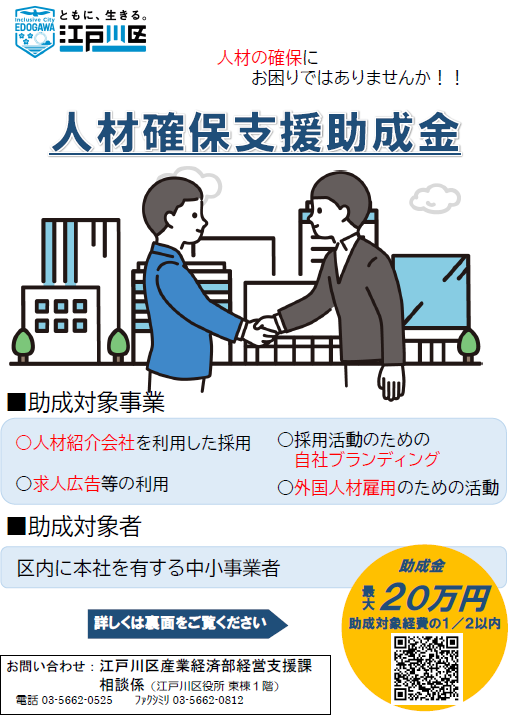 江戸川区内に本社を有する中小事業者が、人材確保を目的として実施する、採用活動、採用ブランディング及び外国人材雇用に係る経費の一部を助成します。