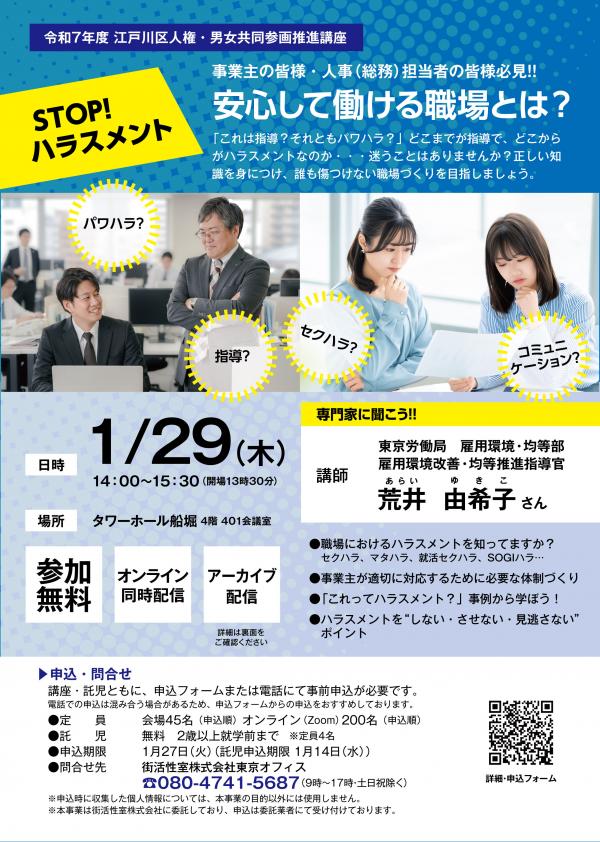 トップページ > 江戸川区イベントカレンダー > 【Zoom同時配信/アーカイブ配信】STOP!ハラスメント 安心して働ける職場とは?