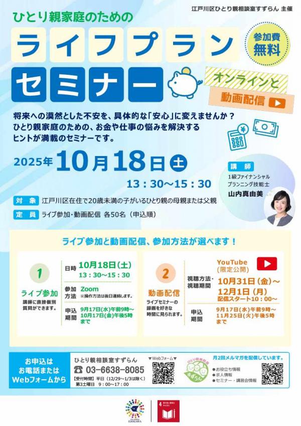 トップページ > 江戸川区イベントカレンダー > ひとり親家庭のためのライフプランセミナー(オンラインと動画配信)