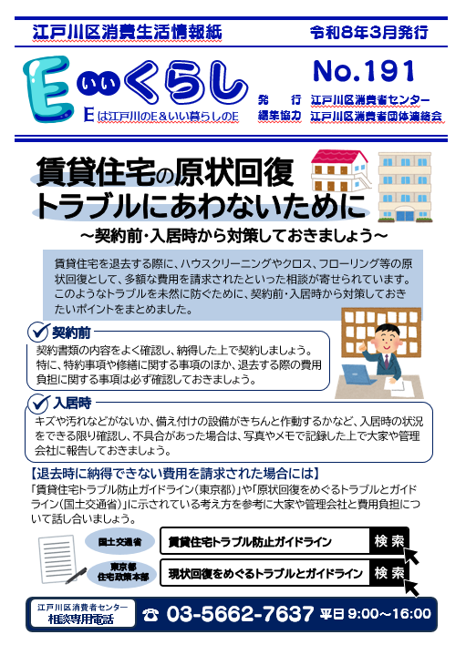 「E(いい)くらし」は、江戸川区消費者団体連絡会と江戸川区消費者センターが年4回発行する情報紙です。