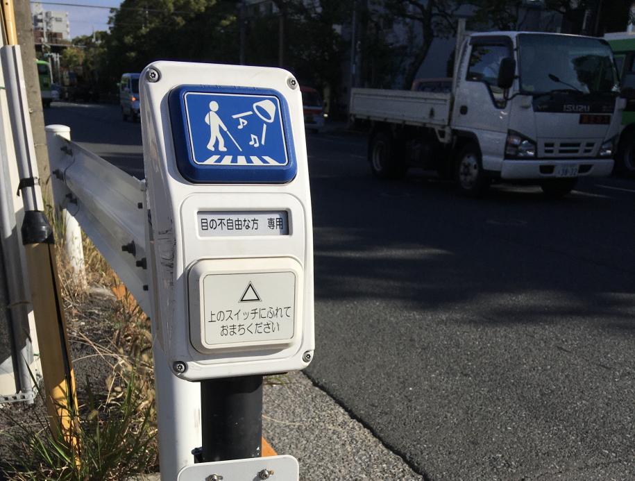 「ピヨ、ピヨ」「カッコー」などの擬音やアナウンスで歩行者信号の状態を示す「音の信号機」。エスコートゾーンと同様、横断方向を誘導する役割も担っており、音の方向をつかみやすいよう、スピーカー(写真上)をできるだけ低い位置に取り付ける工夫も。最新のものはタッチ式スイッチ(写真下)で作動します。