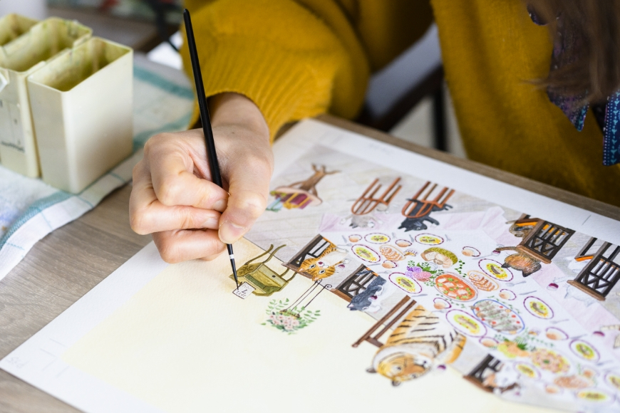物語が完成したら、どのページにどんな絵を描くかを決めるためにラフスケッチを描いていきます。読み手に印象付けたい場面では動物をドーンと大きくしてみよう、お祝いの雰囲気を出すためにこんな料理を食卓に乗せてみよう、なんてことを考えながら描きます。それぞれのページに描き込む絵が決まったら、スケッチブックに下書きをした後、カーボン用紙を使って本番の紙に転写し、いよいよ着彩です。